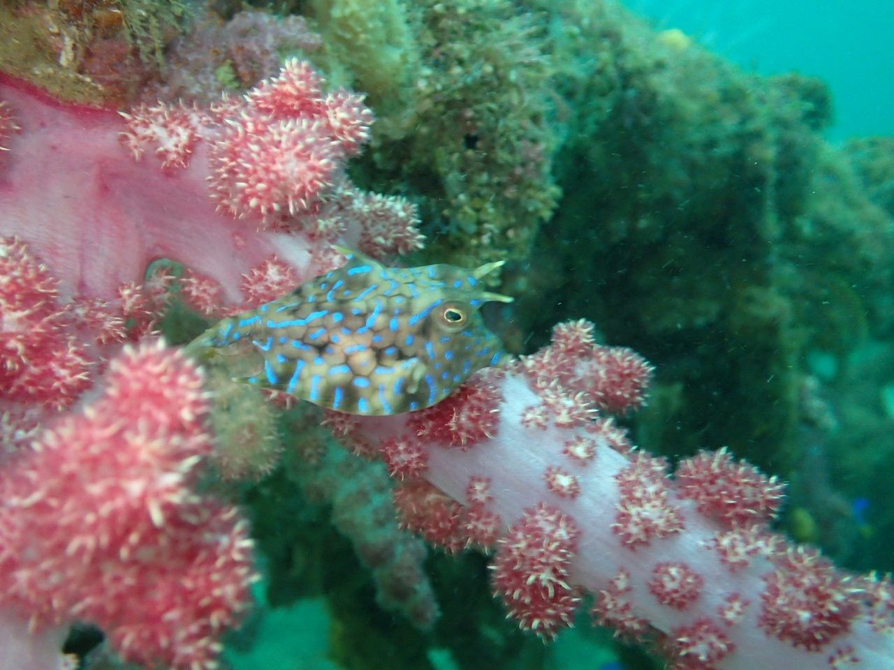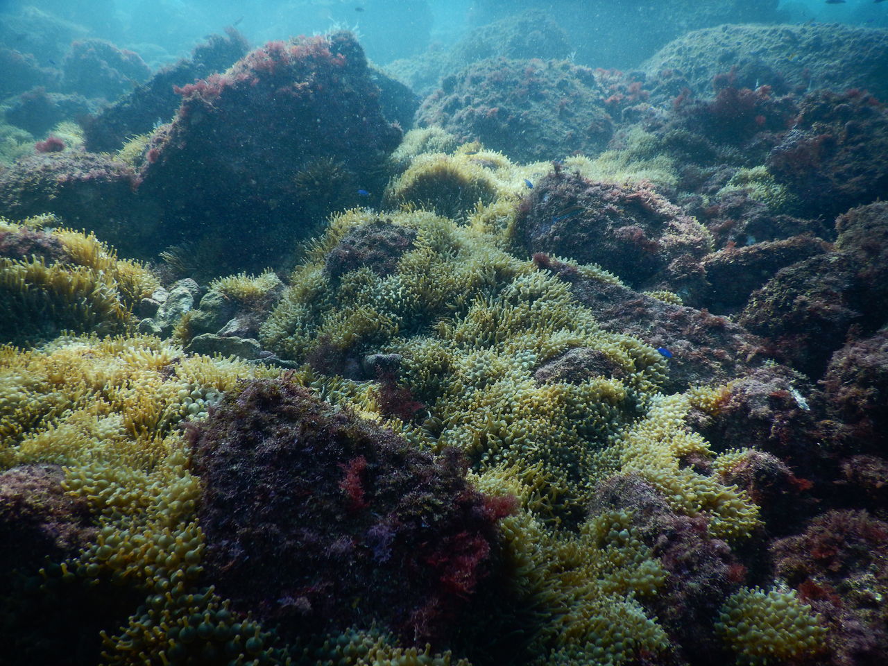 2015年11月21日 水温21.5℃です。 本日は波もなく最高のポカポカ陽気でした。水温は21.5℃、透明度はコカジカ前~魚礁付近で4~5㍍でグリーン。二本目は反対側のコカジカ対岸で入り、透明度は8㍍くらいでブルーでした。波は全くないです。どうも南側の岸には濁った水がたまっているようですが、潮通しの良い北側岸にはきれいな水が流れ込んでいるようです。明日にはすべての水が入れ替わることを期待します。また、明日は今年最後のイセエビDAY、宜しくお願い致します!!生物:ザラカイメンカクレエビ、クシノハカクレエビ、ヒトデヤドリエビ、ガラスハゼ、アオパンダ、カザリイソギンチャクエビ、クマノミ、ミツボシクロスズメyg