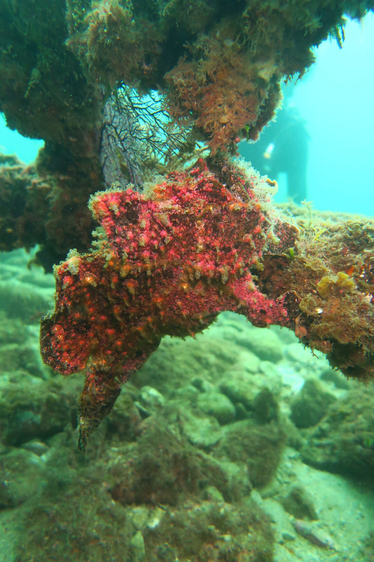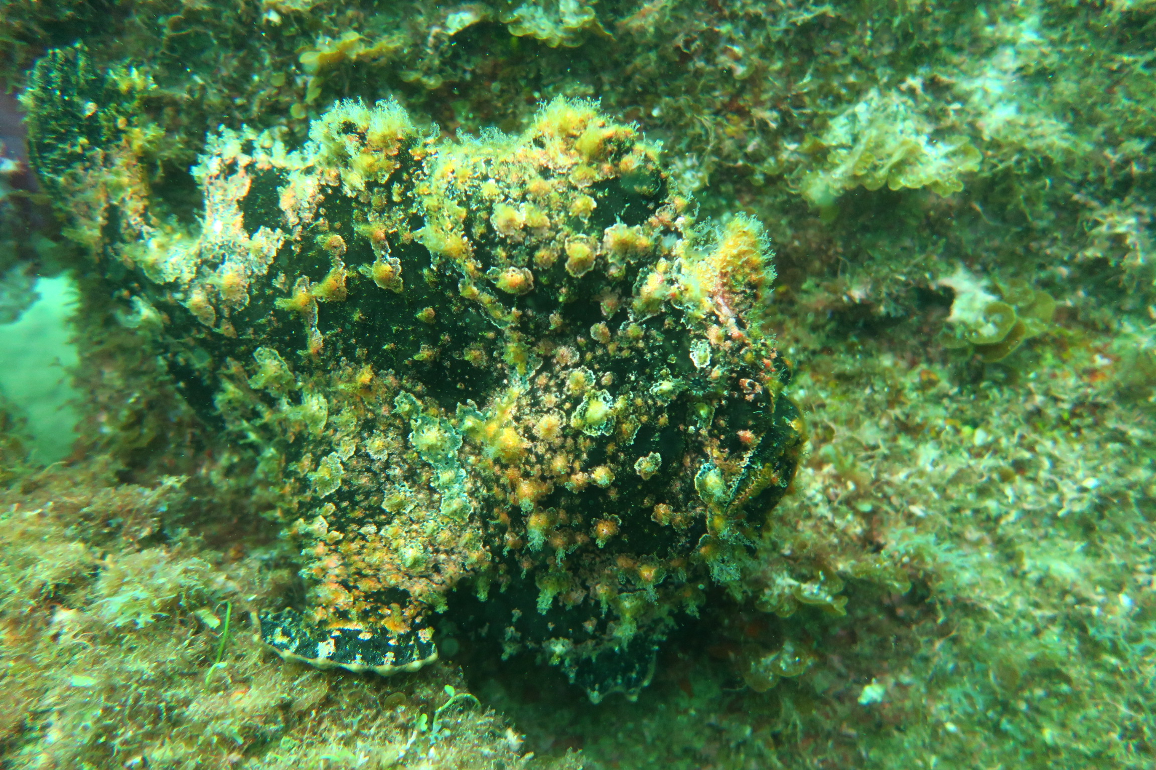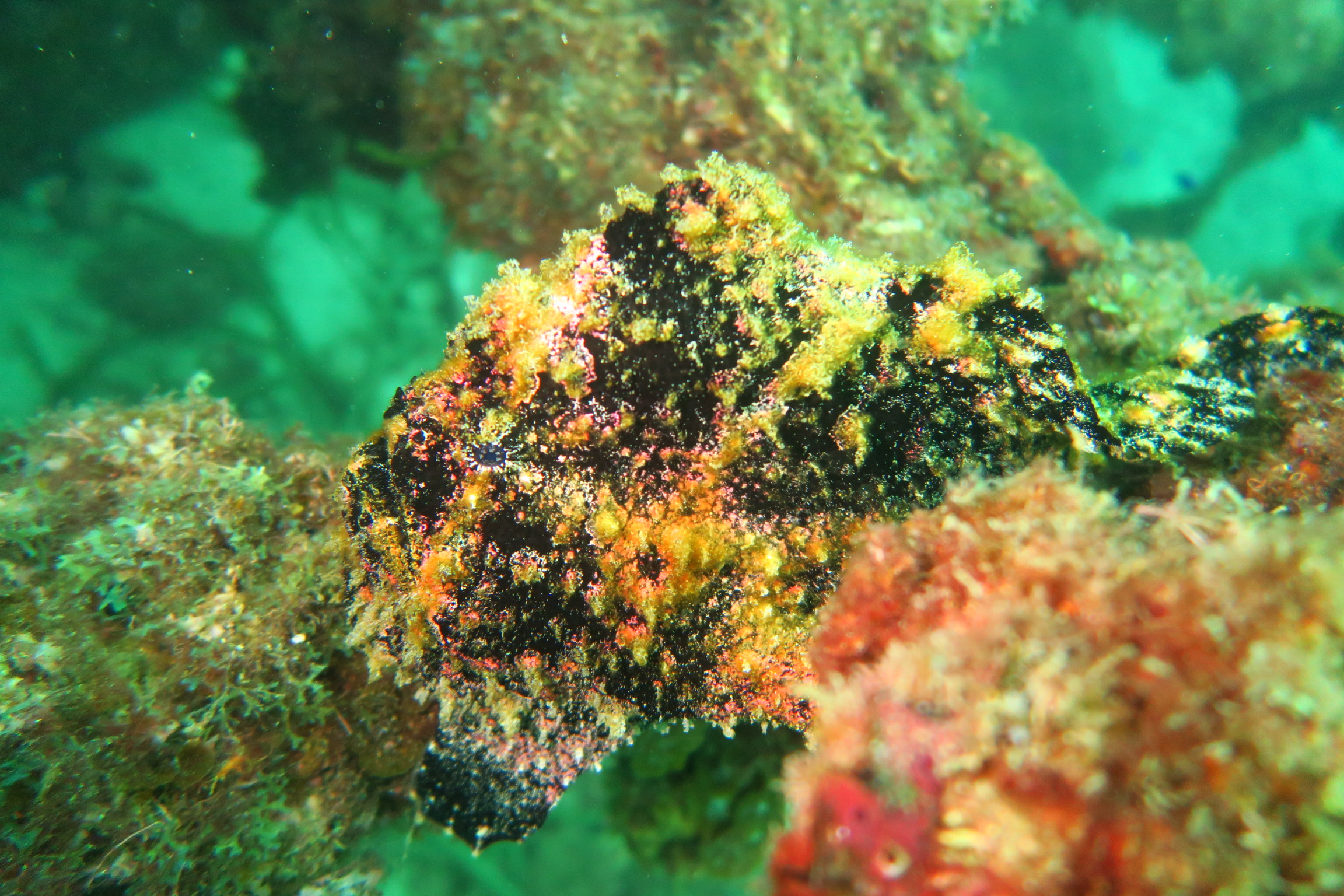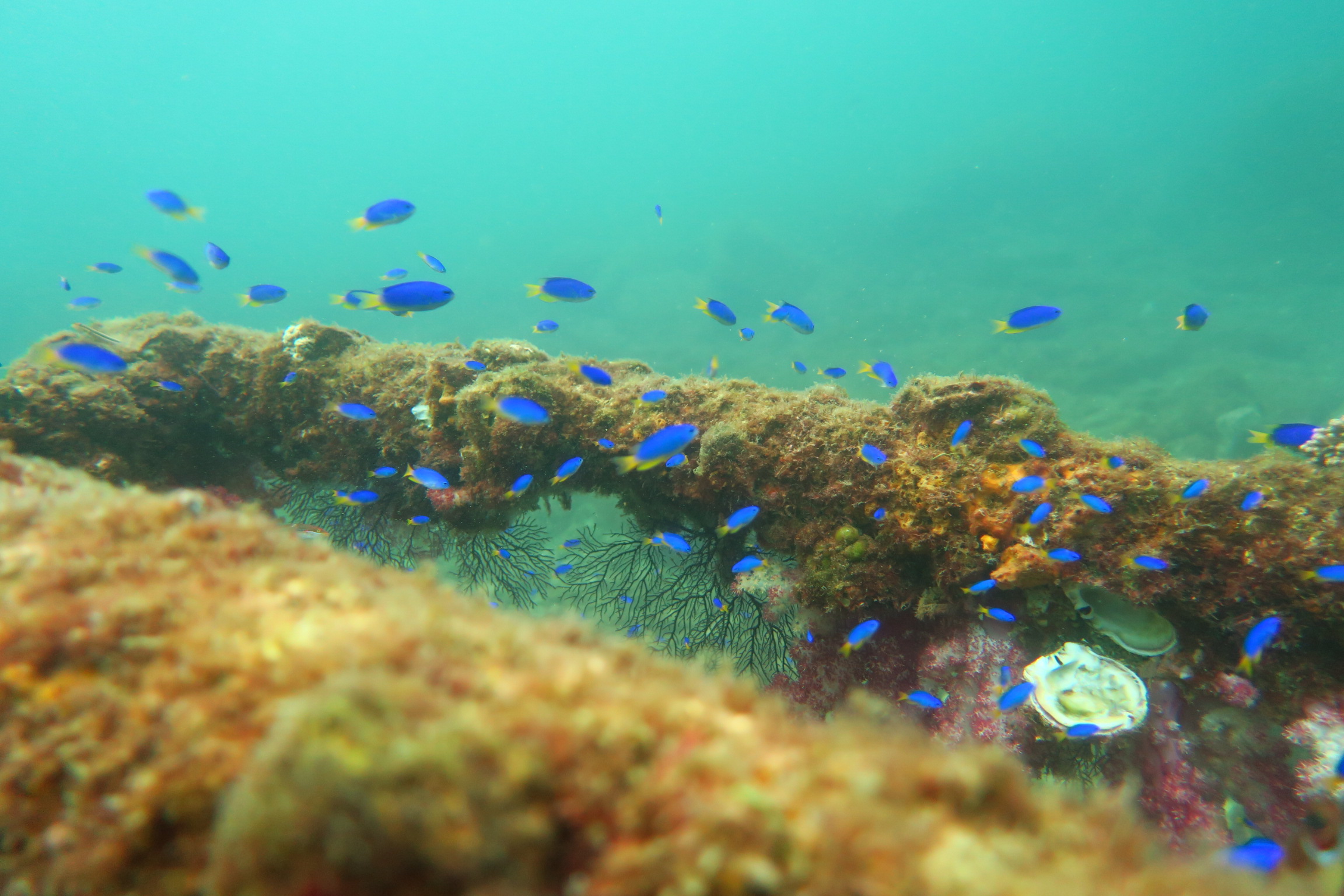 2022年09月07日 台風の影響受けながらでも 今回の大型台風11号の影響はここ梶賀にもうねりが到達していましたがボートポイントは潜れてました。透明度は15mオーバーありましたが今日は10mくらい。でもいい感じのうみです。水温は29℃くらいあり暖かい?暑いです。8月中はアオリイカの産卵やハッチアウトの感動的なシーンも多々ありましたがもう終わりまた来年です。オオモン達もベースはビーチ側の生簀の残骸に4個体いてます。じっとしてると見過ごしてしまう時もありますが動いていると外見はぶさかわなのに(笑)動きがたまんなくかわいい。今日の写真は京都マリンポケット様から提供頂きました。有難うございます。